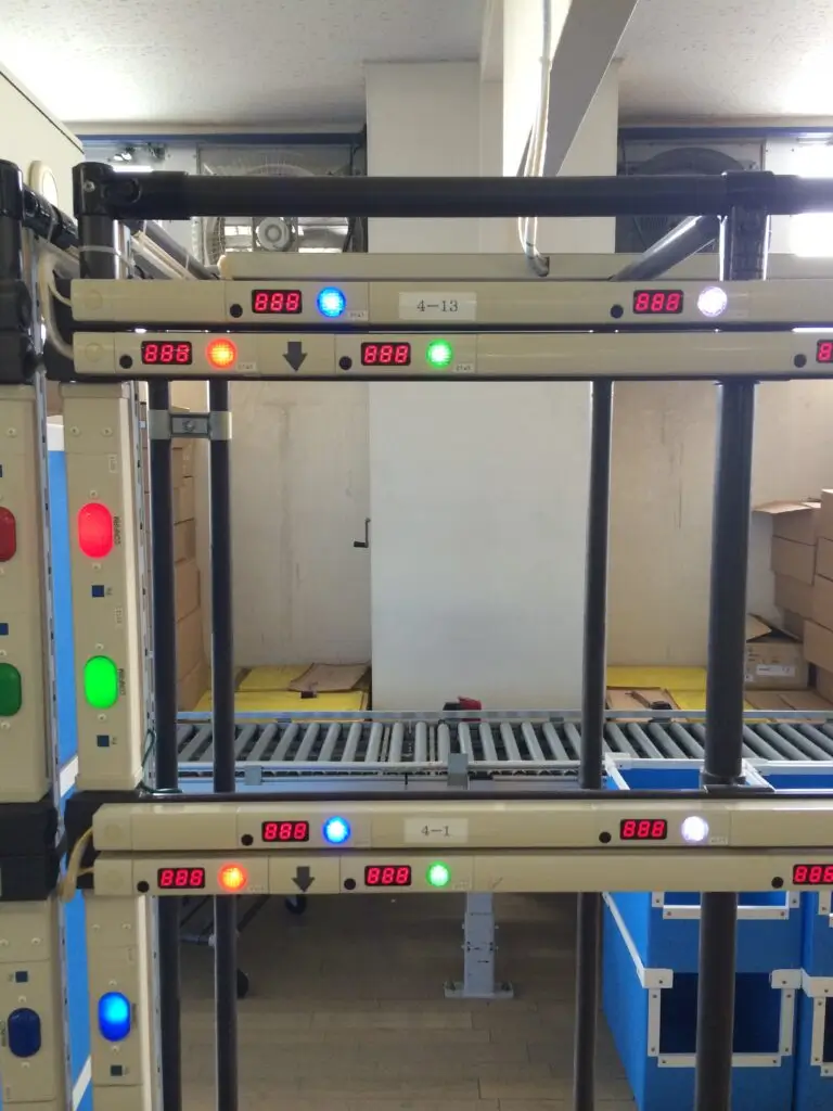 Our pick to light system with compact light modules can be installed even on shelves with narrow dividers. Wireless handy terminals are used to conduct shipping inspections.
